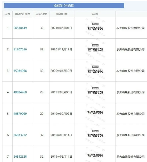 小编发现,农夫山泉申请频率最高的是植物系列。近年来随着人们注重养生的热潮上升,以植物健康为主打的饮品层出不穷,酸奶市场大热,农夫山泉及时申请了“植物酸奶60”系列10个商标,为了后续的市场倾向做准备。
