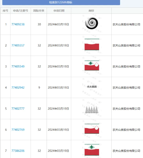截至2024年,农夫山泉股份有限公司递交的商标申请有1226个。由此可见农夫山泉对商标注册的重视程度。
