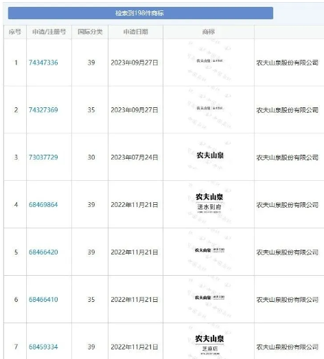 随着农夫山泉的做大做强,越来越多的跟风模仿品牌出现,为了预防被别人“蹭热度”,农夫山泉一口气申请注册了198个“农夫山泉”相关的商标,注册类别几乎覆盖了商标所有的类型。