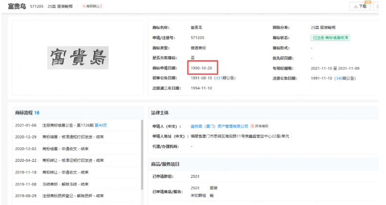 据悉,“富贵鸟”系列品牌商标及相关知识产权,已于2019年通过合法、公开的司法拍卖程序,由盛悦晟(厦门)资产管理有限公司(富贵鸟(厦门)科技集团有限公司母公司)成功竞得并完成权利转移。