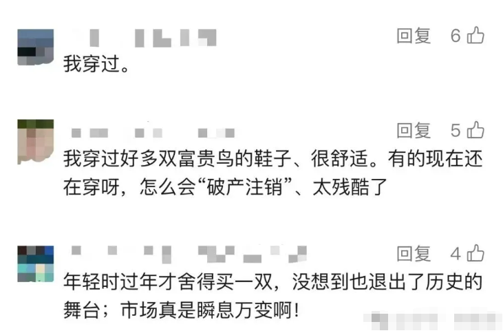 互联网上很多消费者纷纷对富贵鸟的破产表示惋惜。虽然富贵鸟所属公司注销了,但其品牌并未消亡。