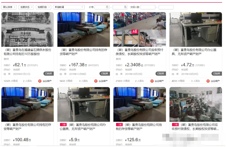 2019年,富贵鸟正式退市,并于同年发布公告表示,公司收到法院民事裁定书显示,驳回富贵鸟有限公司管理人的申请,终止富贵鸟重整程序,宣告富贵鸟破产。