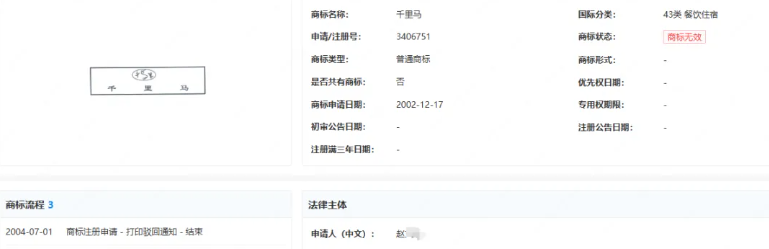 2002年12月,一位来自沈阳的先生拿着“三千里”在餐饮类别中的商标专用权证书,要求赵某立刻将旗下的5家烤肉门店改名。由于没有提前注册商标,赵某在这场商标纠纷中毫无还手之力,无奈之下,他只能将5家烤肉店全部更名为“千里马”烤肉。