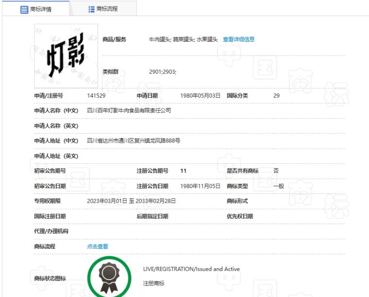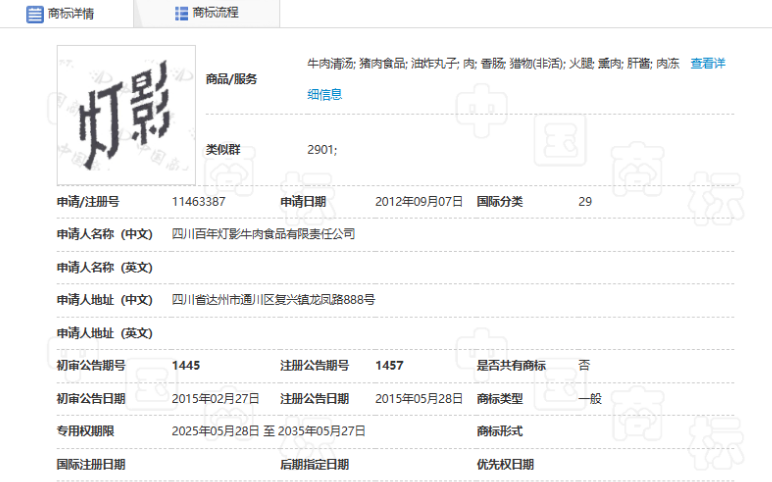 原告四川百年灯影牛肉食品有限责任公司,原达县灯影牛肉厂于1960年向当时负责商标事务的中央工商行政管理局申请注册了“灯影”文字商标。1980年11月,“灯影”文字经国家商标局续展核定使用商品为第29类,即牛肉罐头、水果罐头、蔬菜罐头。“灯影”文字商标自注册以来,一直被续展并持续有效使用。
