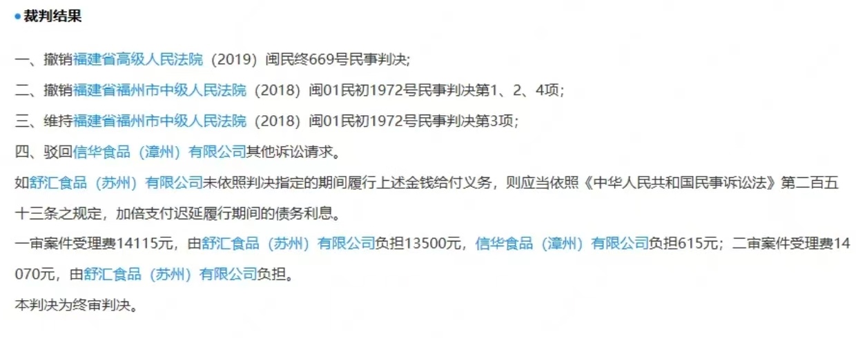最终,一审判决舒汇公司立即停止生产、销售、许诺销售侵害信华公司涉案专利权的产品,兴广得公司停止销售侵权产品,并且舒汇公司需赔偿信华公司经济损失和为制止侵权所支出的合理费用共计103万元。