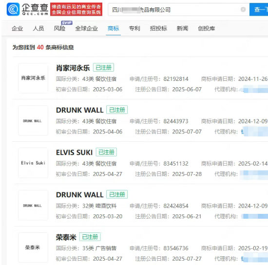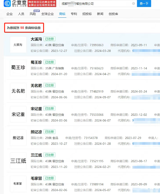 这些假“老店”不仅有招牌,甚至还都申请了商标。据查询,该集团及其名下子公司近年来注册了500多枚商标,其中大量商标都与成都老牌餐饮名称高度相似,例如“三哥田”(仿“三哥田螺”)、“小谭豆”(仿“小谭豆花”)、“曹氏肥”(仿“曹氏肥肠”)。他们有规划地碰瓷成都知名老店、批量抢注商标、复制门店、搞加盟盈利,形成完整的仿冒产业链。甚至放话“不合作就搞死”,利用法律程序拖延维权,致使经营多年的真正老店口碑受损,维权困难。老店商家们只能联合起来对无名集团及其关联公司注册的商标提起无效宣告,或以不正当竞争为由向法院起诉。